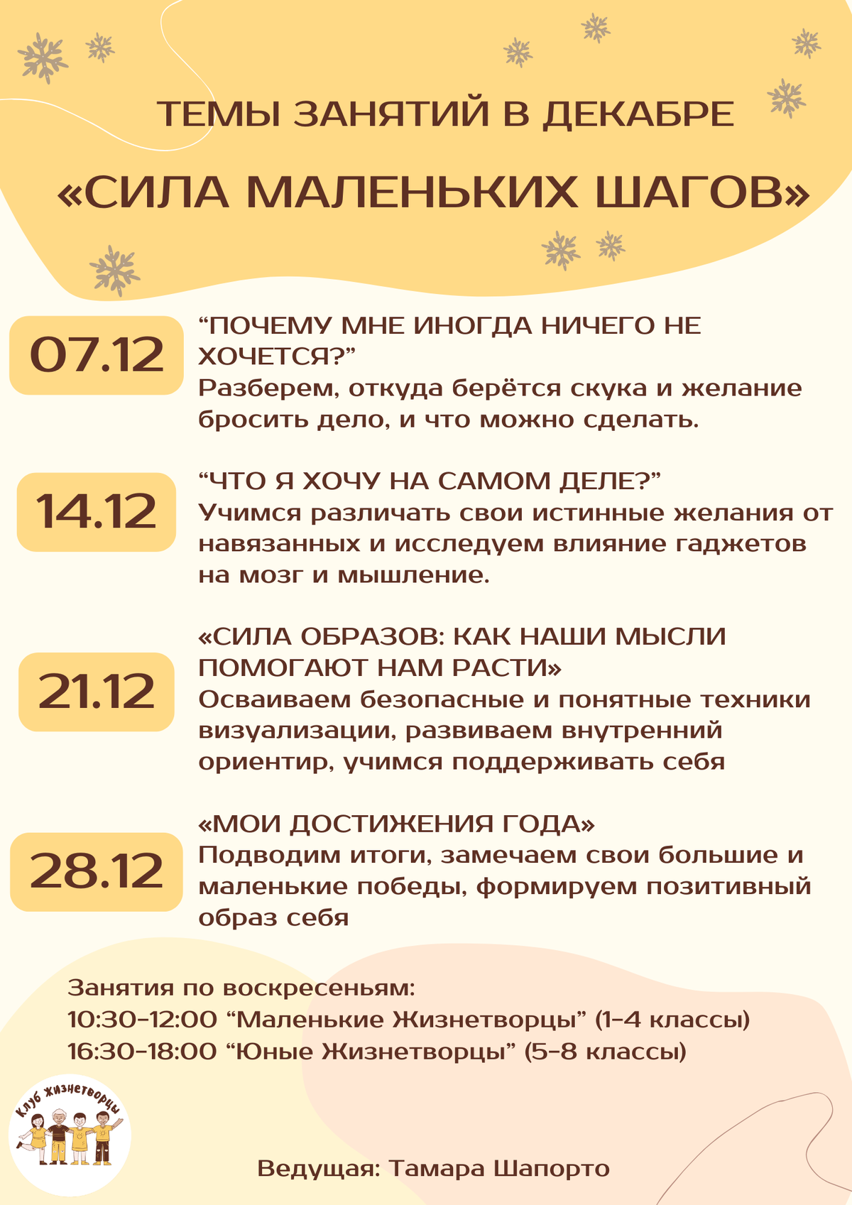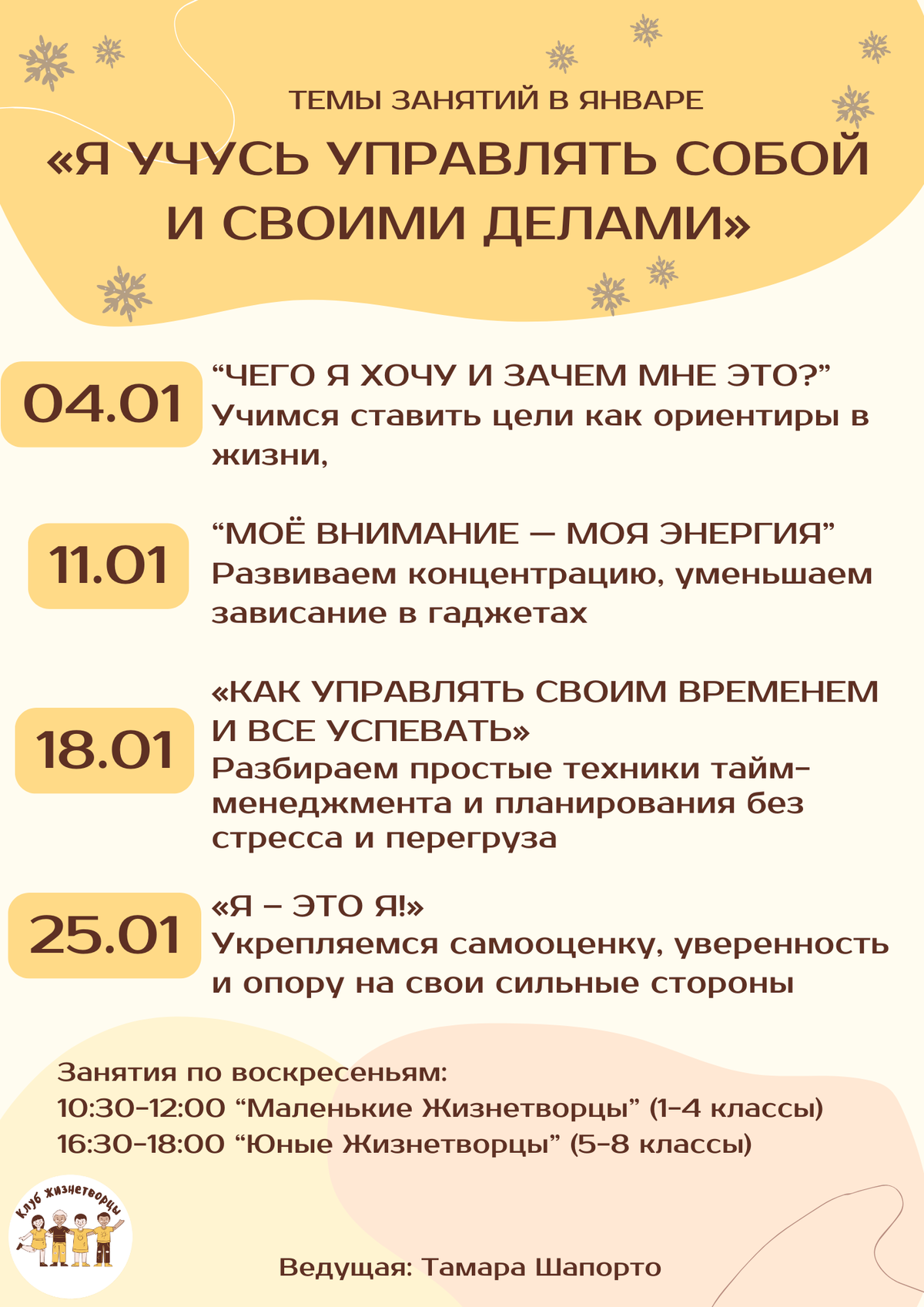 ✨ Все темы будут поданы в игровой и доступной форме для младших школьников и более глубокой — для подростков. Каждый ребёнок получит практики, которые можно использовать в школе и дома.